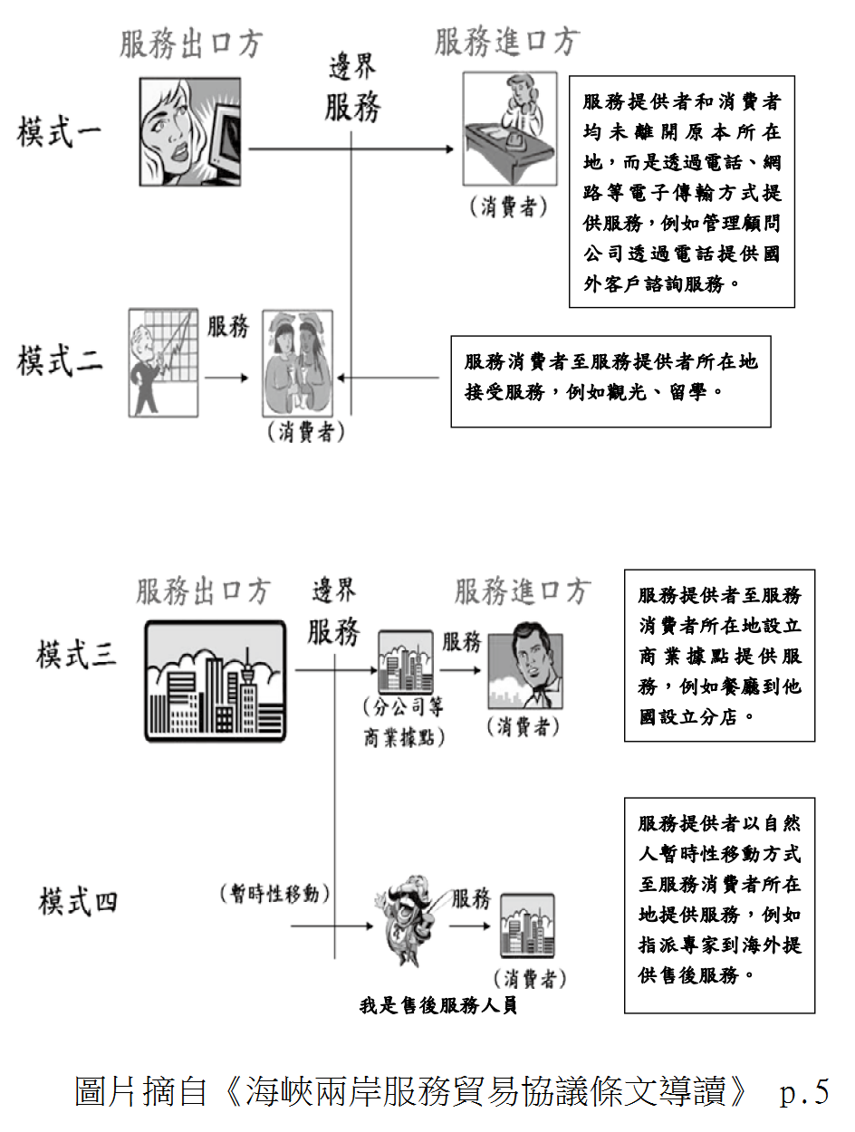 先解釋服務貿易有哪些模式(摘自《海峽兩岸服務貿易協議條文導讀》[1]):